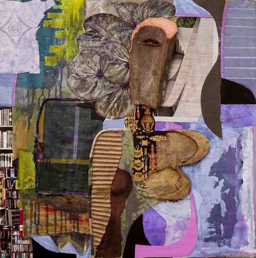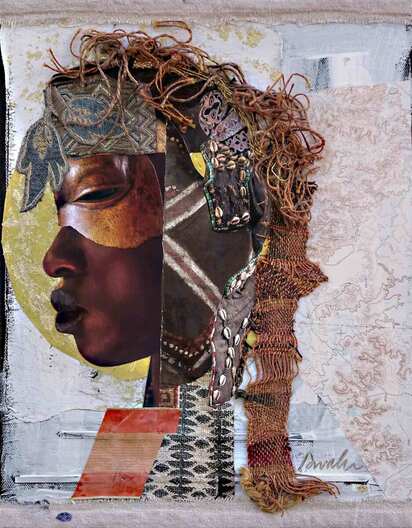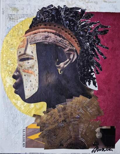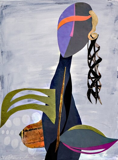 "Bird Gonna Fly", 2024 34 x15 Inspired by African masks, this mixed media is about the journey