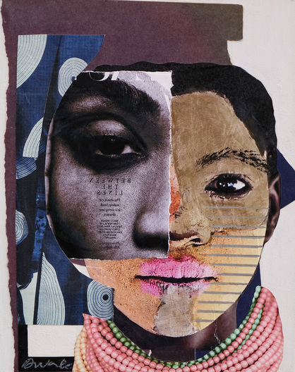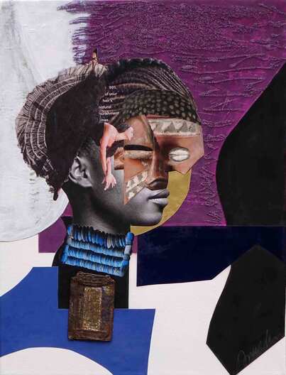 Created with acrylic on canvas and paper, this artwork showcases a unique mixed media collage technique. The contemporary, figurative style, with hints of modernism, brings a fresh perspective to the subject of women. The black portrait of a nude woman is particularly striking, drawing parallels to the works of Deborah Roberts, Romare Bearden, icons of black art. Mixed media acrylic painting, 24x18